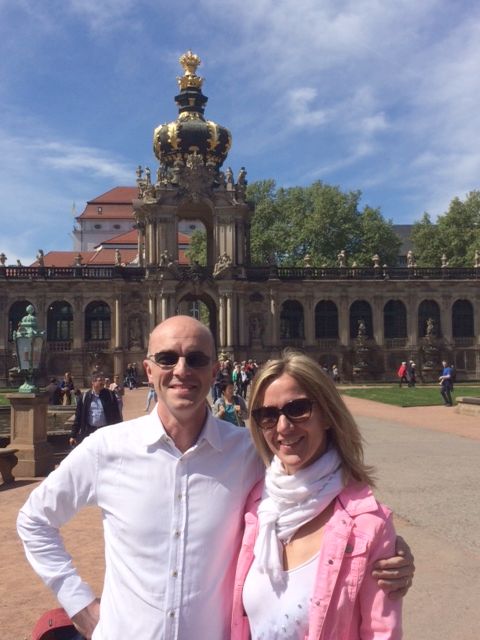 Oben: Heiratsfoto 1997. - Rechts: Andy und Michaela vor dem Zwinger in Dresden 2015.
