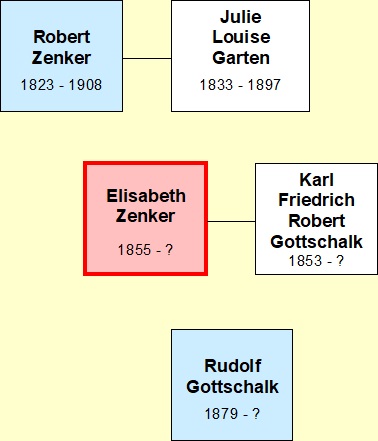 Agnes Elisabeth Zenker, geboren am 16. August 1855, vermählt mit Karl Friedrich Robert Gottschalk, Major a. D. in Gossensass (geb. 19. März 1853). Ihr Sohn heisst Ernst Erich Rudolf, geboren am 28. Februar 1879.