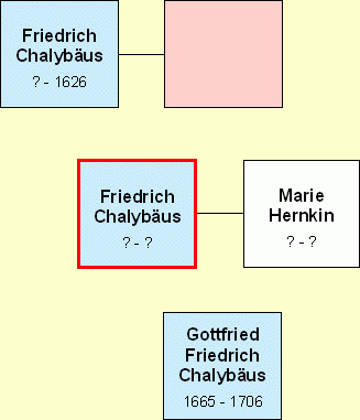 Friedrich Chalybäus, war Goldschmied in Spremberg (Sachsen). Sein Vater trug den selben Namen. Er war Diakonus in Spremberg seit dem 10 Oktober 1618. Er ist am 29 Oktober 1626 in Spremberg an der Pest gestorben. [Quelle: Sabine Strietzel-Hube] Kind: