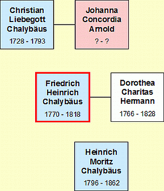 Friedrich Heinrich Chalybäus, geboren am 12. Januar 1770 in Pfaffroda (Sachsen), vermählt am 2. September 1794 mit Dorothea Charitas Hermann (aus Cämmerswalde, Sachsen), gestorben am 14 Juni 1818 in Pfaffroda. Pfarrer in Pfaffroda. [Quellen: Sabine Strietzel-Hube u. Heiner Haustein] Kind: