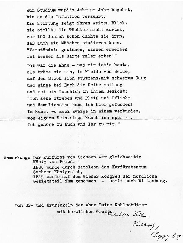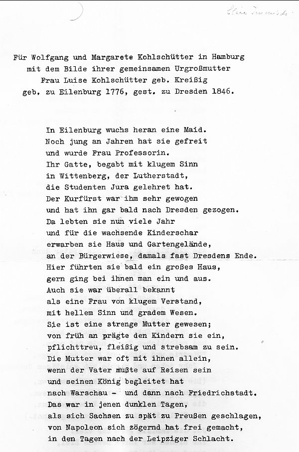 Hyllning till Luise Kohlschütter f. Kreissig (1776-1846)