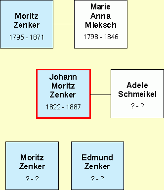 Johann Moritz Zenker ist am 14. Februar 1822 geboren, gestorben am 22. März 1887, Referendar in Nossen, vermählt mit Adele Schmeikel. Seine Kinder heissen: