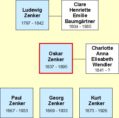 Julius Oskar Zenker ist am 23. Januar 1837 geboren, gestorben am 25. Mai 1895, Dr. iur., Rechtsanwalt, Justizrat in Leipzig, seit 26. Mai 1866 vermählt mit Charlotte Anna Elisabeth Wendler aus Leipzig (geb. 23. August 1841). Seine Kinder sind: