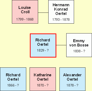 Hermann Richard Oertel ist am 24. März 1829 geboren, vermählt seit 18. August 1862 mit Emmy von Bosse (geb. 8. August 1838), Obersteuerinspektor a.D., Oberzollrat in Schandau. Seine Kinder sind: