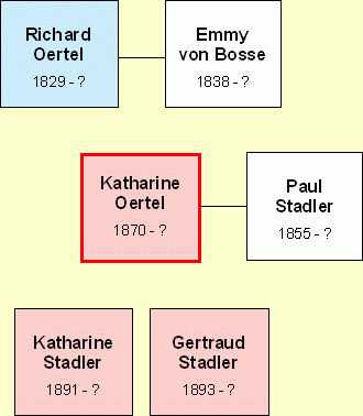 Katharine Louise Emilie Oertel ist am 27. Juni 1870 geboren, vermählt mit Dr. iur. Paul Stadler, Landrichter a. D. (geb. 9. Oktober 1855) in Schandau. Ihre Kinder heissen: